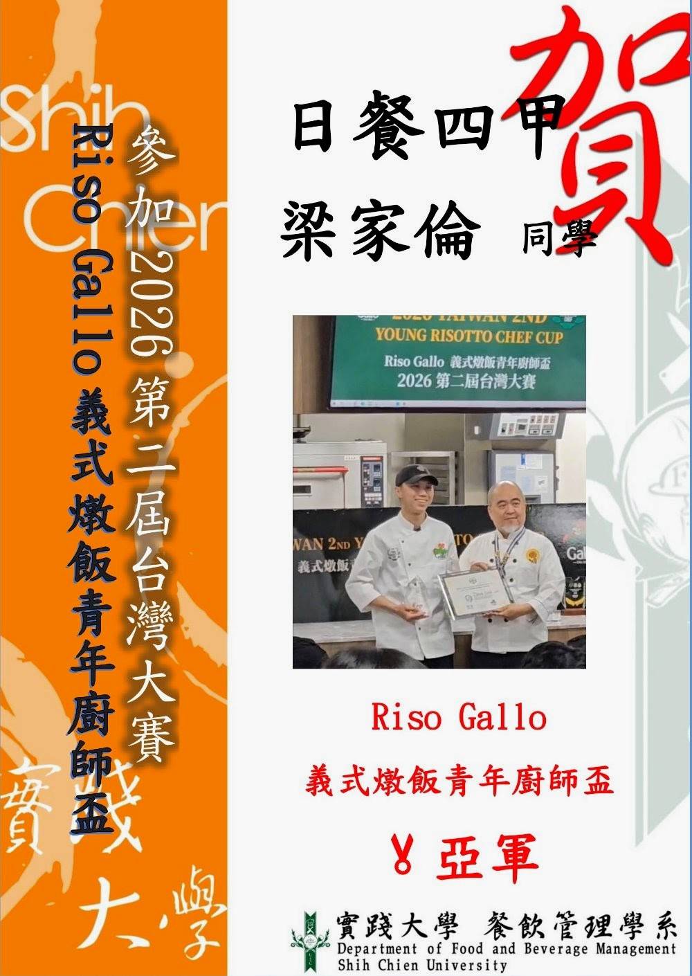 恭賀 第二屆 Riso Gallo 義式燉飯青年廚師盃 台灣大賽 【學生組】梁家綸 亞軍得主 🥈